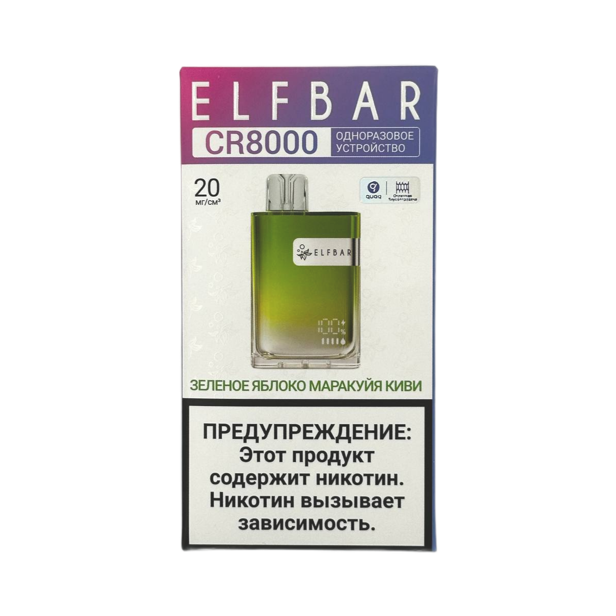 ELFBAR 8000 CR “Зеленое яблоко, маракуйя, киви” подходит как опытным пользователям, так и новичкам. Использование максимально простое: извлеките устройство из упаковки и наслаждайтесь насыщенным вкусом.