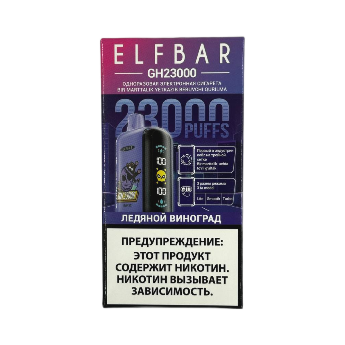 Электронная сигарета ELFBAR GH 23000 – это современное устройство для парения с уникальным вкусом ледяного винограда, которое предлагает непревзойденный опыт курения. Данная модель является одной из популярных среди молодежи и ценителей электронных систем доставки никотина.